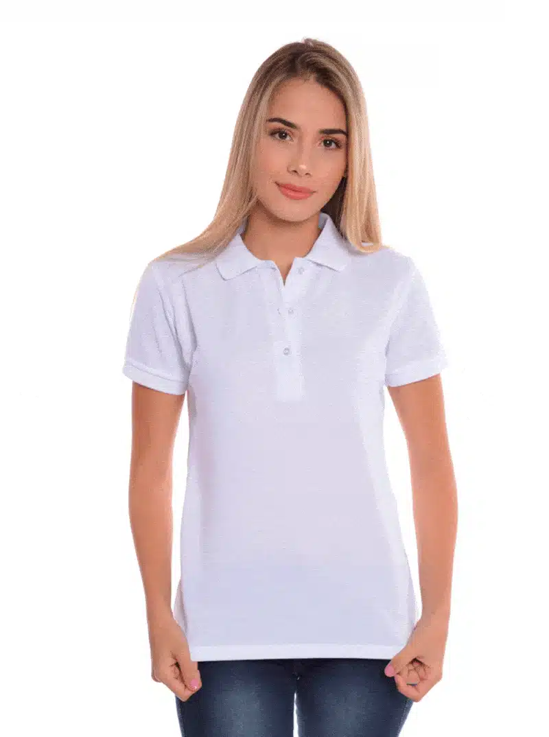 Camiseta tipo polo blanca para mujer, en todas las tallas, ademas de 30 colores diferentes y logos empresariales bordados.